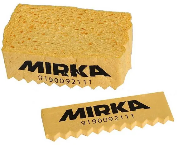 Lisovaná houba Mirka. Z jedné strany profilovaná. Po namočení do vody se roztáhne do velikosti 135x100x40mm. Udrží v sobě hodně vody, proto je vhodná pro omývací práce v autolakovnách.